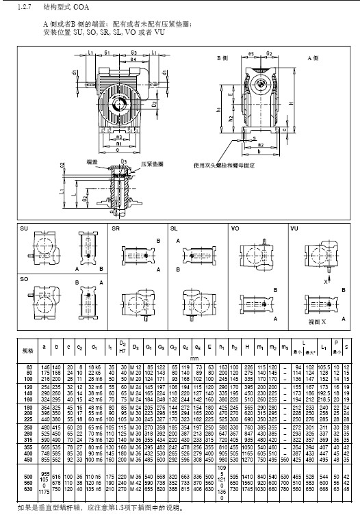 COA蝸輪蝸桿減速機安裝形式為蝸桿上置式,蝸輪為孔輸出。傳動比多樣,中心距63-630mm,具體中心距分一下幾種: