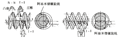 圖1所示為幾種蝸桿的車削方法,其中圖(a)、(c)所示為阿基米德(ZA)蝸桿和漸開線(ZI)蝸桿。當蝸桿的頭數(shù)增多、導程角增大時,其幾何形狀和切削角度將出現(xiàn)加工困難。圖(b)所示為一種延伸漸開線蝸桿,又稱齒槽法向直廓(ZN